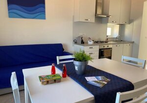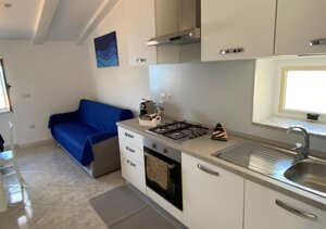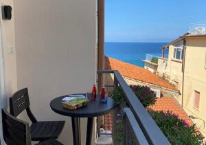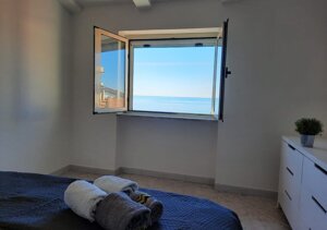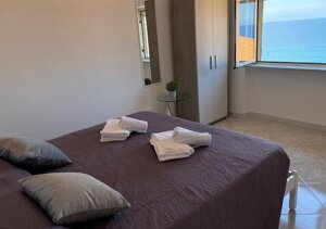 Italian - Appartamento De Luxe con vista mare, climatizzatori, lavatrice. Ha due camere da letto, una matrimoniale con vista mare e una camera con letto a castello; un soggiorno cucina, un bagno e un terrazzino esterno vista mare con tavolino e sedie. Per accedere all'appartamento bisogna salire una scalinata con 4 rampe di scale (50 GRADINI), in un vicolo tipico del borgo marinaro situato sul lungomare di Marina di Pisciotta. L'appartamento dispone di 5/6 posti letto. Servizi aggiuntivi a pagamento: Lenzuola, asciugamani e bagnoschiuma-shampoo 10€ a persona. Posto auto 10€ al giorno.