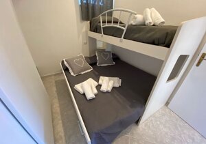 English - De Luxe apartment with sea view, air conditioning, washing machine, etc. It has two bedrooms, one double with sea view, living room with kitchen, bathroom and outdoor terrace with table and chairs. Additional paid services: Sheets, towels and shower gel-shampoo 10 € per person. Parking space 10 € per day.